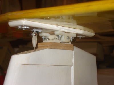 ● 垂直尾翼直下の胴体下面にハッチを設けて一次リンクの台座を組み込んであります。なるべく直線配置のリンケージになる様にする事がT型尾翼のリンケージのガタを防ぐ基本です。