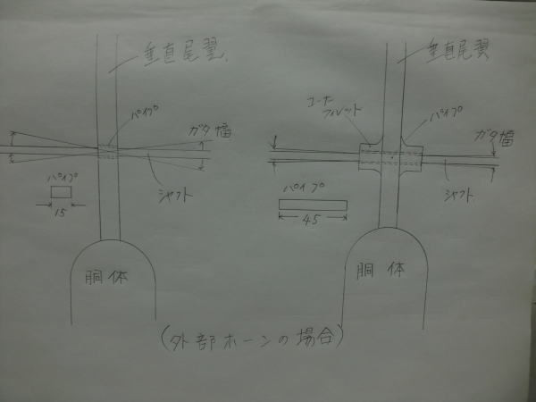 ● 此方は昭和の遺物の中でも難敵最強!・・・。グラス胴体の内蔵型ホーンの改造例です。キットに付属の原寸図面の場合は、イラストの左側みたいな内蔵の仕方でしょう?・・・。フィレットが着いてる機体ならば・・・作動時のガタ幅は軽減される様なんですが・・・。グラス面には外部のスタビライザーとの接触面を考慮して、隙間を確保する目的で段付きのプラ製のブッシュを差し込むタイプが多いですね。ただし・・・此れは、正確にグラス面に孔を開けれた場合のお話で・・・少しでもズレると全く意味の無いシャフトのガイドパイプに成ったりします・・・。此れが昭和の遺物を安く落札して、組立途中でフリーズしちゃったモデラーさんの成れの果てです。