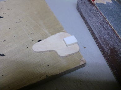 ● 指で抑えて小口の調整・・・。なんて無理でっせえ・・・。サンドホルダーは工作台に直角ですが、小口に宛てて前後すると・・・摩擦が凄くて指では抑えが利きません。まあ・・・こういう時は治具を作って指の一部を肩代わりしてもらいます。単純にベニヤをコの字に切って材料を嵌め込み、上から抑え込めば擦り荷重にも充分耐えられます。