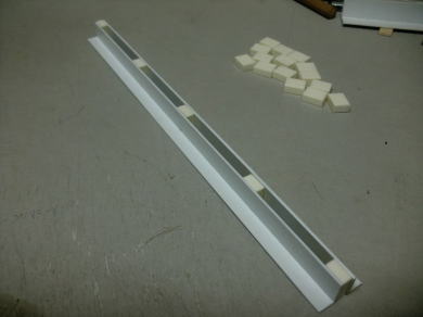 ● 穴開け作業が終わりました。左の画像では孔のピッチが其々揃っていますが、右の画像では手前から2番目と4番目のアングルブラケットの孔位置がズレてる様に見えます。これ・・・孔の開け間違いではありません。スポイラーは左右の主翼に取り付けますが、横にスライドしながら立ち上げるブレーキの場合・・・左右対称に立ち上げないと成りません。よって一列に並べると孔位置がズレてる様に見えてるだけで、実際には左右対称の同じ位置に孔が開いています。