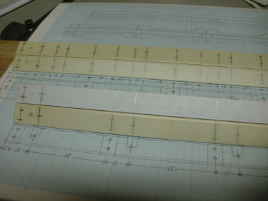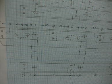 ● まずは作図面より書き込んだ寸法位置に正確にピッチの線を画き込みます。次に各部品の高さの位置を書き込みます。此の交点がビス孔の位置です。全て最終的には2mmのバカ孔になりますが、部品を組み合わせた状態での孔加工ですので・・・この位置がズレると最終的な調整が難しく成ります。よって、しばし・・・作業手順の段取りをシュミレート・・・。