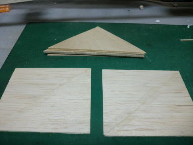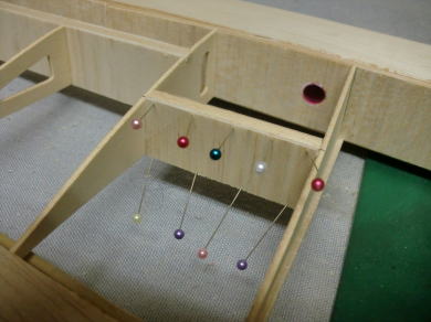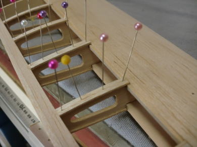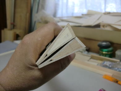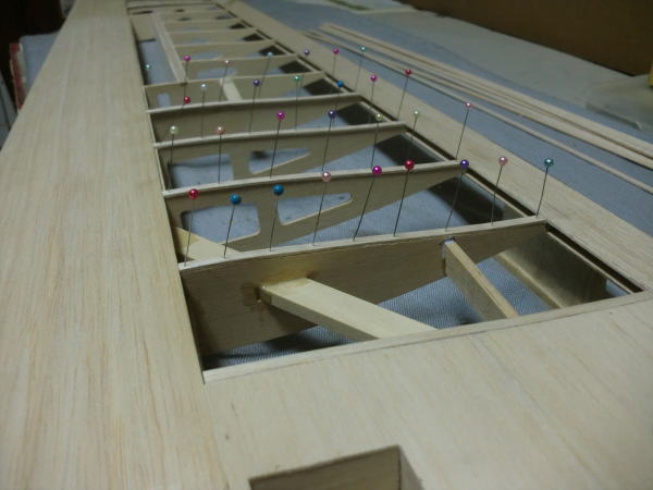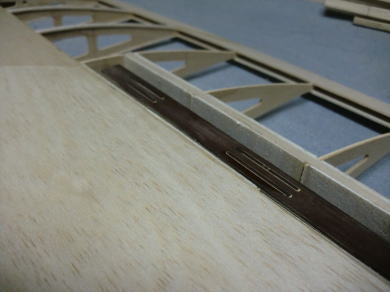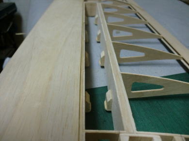 ● 主翼のリブキャップの取り付けに入りました。キット付属のリブキャップ用の棒材(3/16×1/16インチ=約5×1,6mm)は、ハード系のバルサを使っていますので、翼型に沿わせ難いです。こういう硬いバルサを翼型に沿わせる時は、貼り込む面にカッターナイフで深さ0,5mm程の筋目の溝を5mm間隔位で入れてから貼り込むと割と湾曲し易くなります。