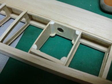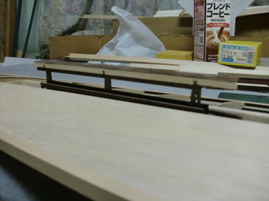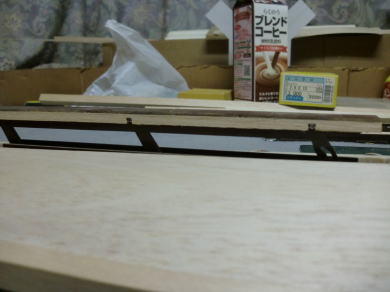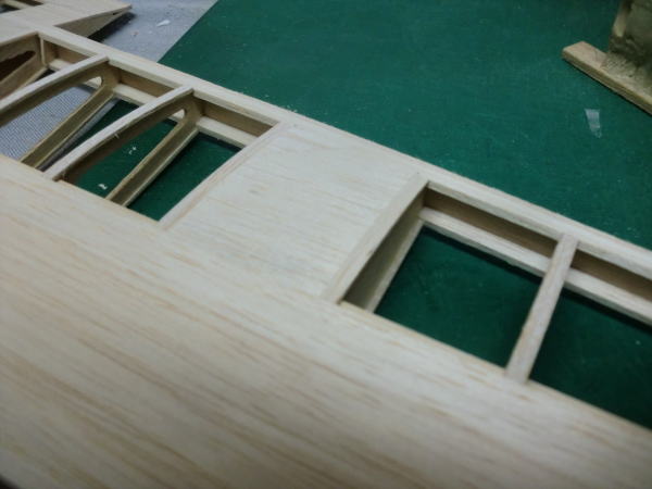 ● 若干隙間が見えますが・・・この隙間が無いと後々の工作で大変困る事に成ります。実機なら季節に対応した金属の収縮に合わせてこういう隙間はゴム系のパテで埋めるんですが、本機の場合はベニヤの帯材を埋め込んで木口の補強を行います。朽ち果てるスピードは、ベニヤに比べれば柔らかいバルサの方が早いですからね。