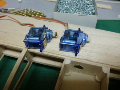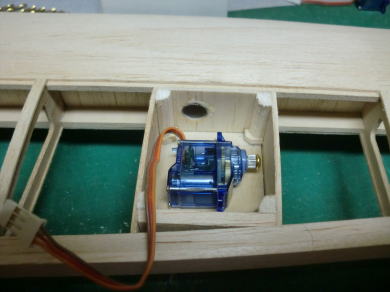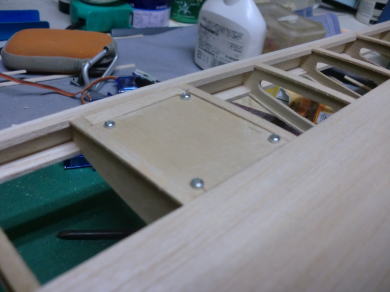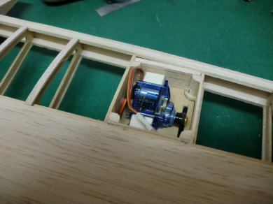 ● サーボ搭載スペースの主翼上面プランクは一番最後に製作するとして、まずは限られた空間に如何にサーボを収めるかを優先して位置決めしています。ハッチよりも大きいと取り付け取り外しが難しく成る・・・、リードハーネスも長過ぎるので短くしたい所なんですが、あまり切った貼ったはしたくないので・・・まあ、毎度の事なんですが、サーボの位置決めの解決策として主翼上面のプランクは最後に回します。
