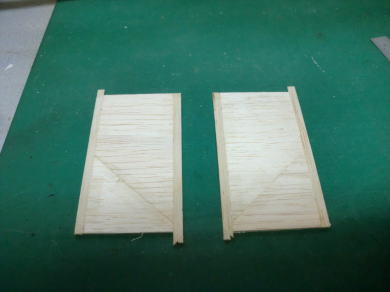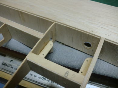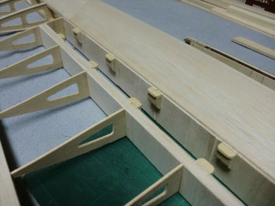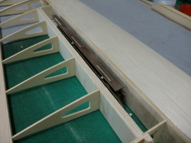 ● エルロン動翼の前縁側をプランクしています。此処で注意する事は、主翼側と同様にヒンジラインが完全なる直線でないと動かす時に上手く作動しません。このヒンジラインが曲がっていると、ひ弱な主翼だと捻じり上がったり下がったりしますので確実に直線が出る様に調整しましょう。完全に直線のヒンジラインならば、リンケージ前のエルロンは常に垂れ下がった状態を保ちます。