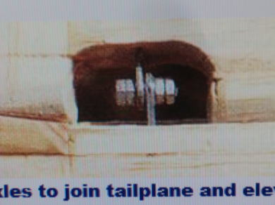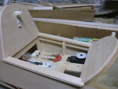 ● 受信機バッテリーは機首のノーズコーンの左右に振り分けて搭載・・・。そりゃそうだろうなあ・・・このサイズならおそらく単二型バッテリーを並列で二つ繋いで・・・此れ重心合わせのバラスト兼用でしょうなあ・・・。もう一つ・・・やっぱりキット指定の鉛の割ピンヒンジじゃ無理だったのかなあ・・・。ユニバーサルヘッド(ナベ頭)のビスの頭を飛ばして寸切りビスとし・・・両側からダブルナットでシャフトを固定・・・。くり抜き穴も指定より大きく改造してるし・・・。まあ・・・普通に考えるなら解る事なんだが、寸切りシャフトの長さの分の倍をくり抜かなきゃね・・・シャフトは通せませんし(笑)・・・。