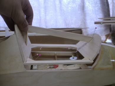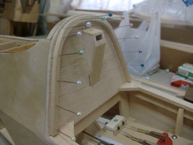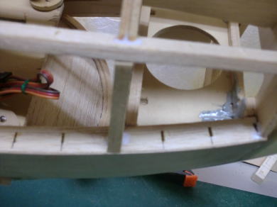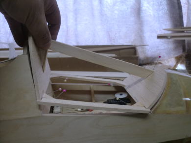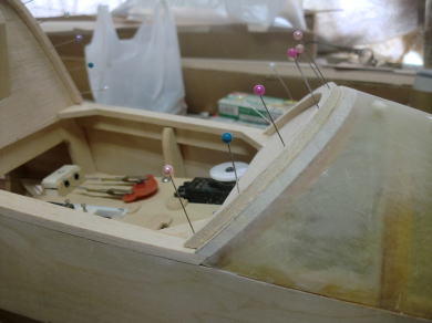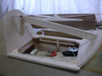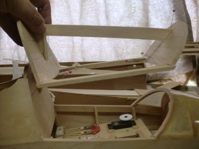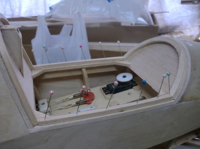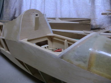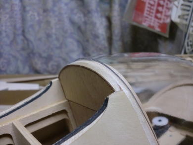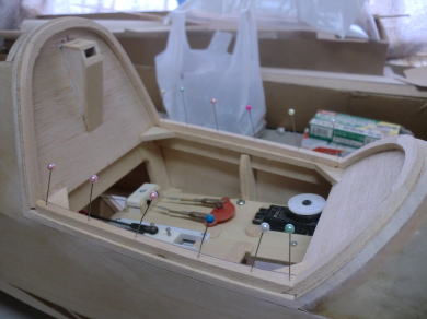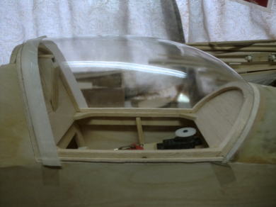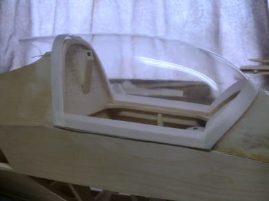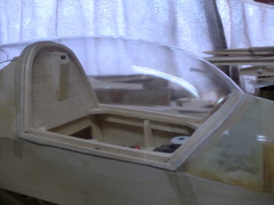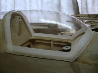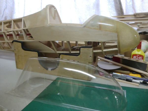 ● インストパネルが奥に取り付けられているのでスケール感はバッチリ!・・・なんだが、キャノピーの枠自体の強度が・・・無い・・・。実機はステンレスのパイプと透明アクリル樹脂の強固な素材で構成されたキャノピーなので、それ自体で形状を維持する事は出来るのだが・・・。そこで本機では画像の様にバルサオンリーで構成したオリジナル機よりも強固な造りとしています。