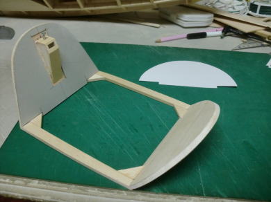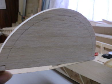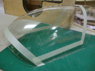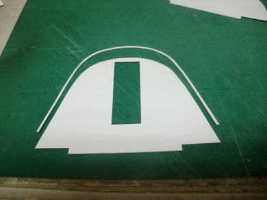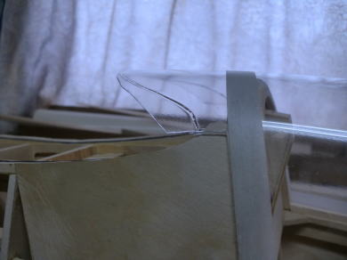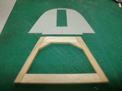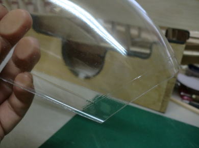 ● コクピットの前後の胴枠に合わせて形紙を合わせ形状をトレースしました。このトレースした形紙は、段付加工されたキャノピーシートの厚み分を差し引いた寸法で仕上げますので、約2mmを周囲から切り落とします。当工房のオリジナル機種のコクピットは粗・・・段付きのコクピットにキャノピーをはめ込んでありますが、仕上げが楽に成る理由と・・・キャノピー本体が衝撃でも割れ難くなるので採用しています。