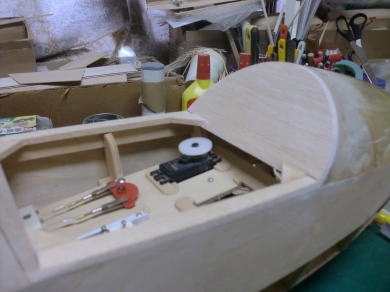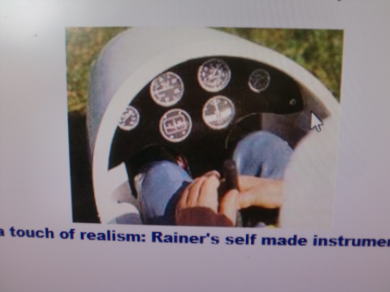 ● 本機のコクピット前方は細いベニヤ製の枠をグラス製コーンの縁に貼り込んで、機首内部を広く取ってあるんですが、キット製造元のホームページを観ると、搭載メカを胴体の側板付近のあらゆる隙間に埋め込み・・・スケールピッタリの人形を搭載する為の艤装に拘ってるモデラー画像を多く見ました。実機(ASK-8)のインストパネル(計器盤)は、コクピット前方のノーズコーン内の奥の方に設置してありますが、模型機で此れを先付けすると・・・重心合わせのバッテリーもバラストも搭載し難くなります。そこで本機ではキャノピー枠にインストパネルを取り付けますが、其のパネル自体がノックピンの代わりをする構造にも成ります。