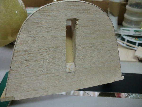 ● PVC樹脂のノックピンがカギ型なのは、こういう理由が有るんですなあ・・・。ノックピンの上部はキャノピーの固定・・・。スライドさせないとコクピットが外せないので、こういう形状の凹み具合なんですが。この角型の変形溝に樹脂製ノックピンのビス止めした角型の本体が完全に嵌り込む事でコクピット後部のヘッドレストフレームを安定させています。ベニヤで作っても良いんですがねえ・・・別に厚みのあるバルサで作っても同じ事なんで・・・。だったら厚さ5mmのスチレンでも出来るじゃん!って気づいたモデラーさんは遠慮なく実践してみましょう・・・。まあ・・・そういう汎用をするモデラーも出るだろうと、敢えて5mmのバルサを使いました。