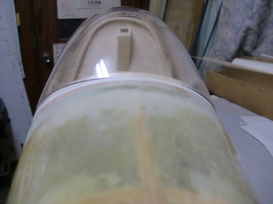 ● 少しずつ・・・少しずつカットしながらの作業です・・・。段付きコクピットと聞いて、当工房の特別な加工と思ってるモデラーも多いかと・・・。でもですなあ・・・作業工程を観て何も気づきませんでしたか?・・・。段が付いてるからオリジナルキャノピーのカットラインを小さくしてるって思ってるモデラーが多いかと・・・。胴体のアウトラインとキャノピー成形シートの外面をツライチにするには・・・コクピットをキャノピーシートの厚み分小さく作る事が必要なんですが、実はこのキャノピーの木型もシートの厚み分小さく削り出してあります。ところがですなあ・・・このキャノピーを機首方向から見ると、上部のアールを含む台型に見えませんか?・・・此れに気づいたモデラーさんなら、木型の作りに光明が見えたかも・・・。木型造りが少し楽に成ったかも知れませんね・・・。ただし、機首方向から見ても木型の法則に気づけないネット物知り博士には・・・無理かもなあ(笑)・・・。側面から見ても法則は同じなんですがねえ・・・。博士達には無理かもなあ・・・。