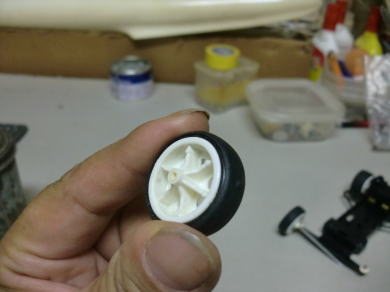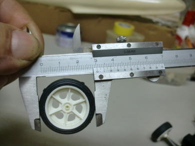 ● 尾輪と成りえる直径28~32mmの範囲で・・・と色々物色してみました。もっと小さい物も有ったんですが、タイヤの幅が20mm近くも有って、今度は尾翼直下の胴体に収まりきれません・・・。よって一番手頃だったのが、ミニ四駆のタイヤでした。軽量且つある程度丈夫・・・。まあ・・・既にご存知のモデラーも多いとは思いますが、小型EDF機やらピーナッツスケールの大戦機やらのリトラクト・ホイルに使えるので便利ですよ。