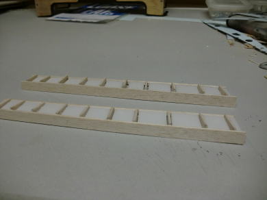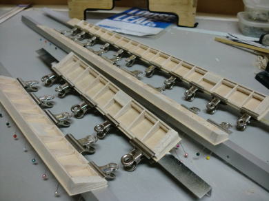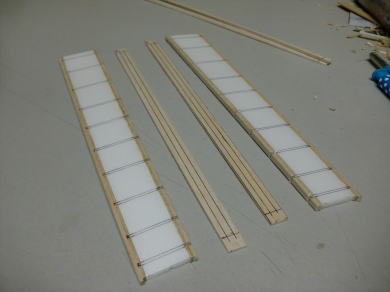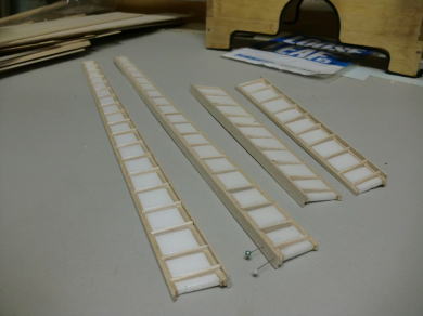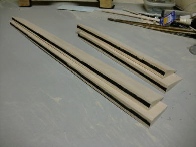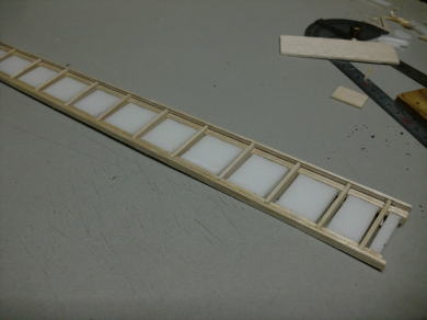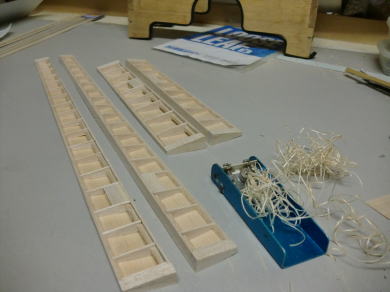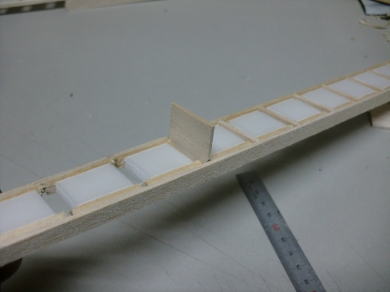 ● エルロン部材にリブを挿入しています。このエルロン材がテーパーエルロンなので、挿入するリブ材の前後方向の寸法は、少しずつ(約0,6mm)短くなっていきますので、同じサイズを量産して嵌めこむという作業も不可能です。後縁側の厚みは5mmなので、角度は常に隣のリブに比例した形状なんですが・・・。要するに、前縁側もテーパー状に翼端方向に向かって薄くなります。よって、一枚ずつ切り出して加工し取り付けます。
