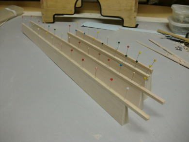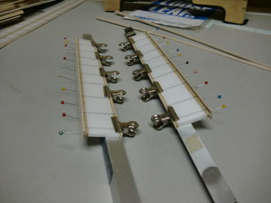 ● この補助材を貼る時は、画像の様に後縁側をアングル材で挟んで直線を確保してから印に合わせて貼り込みます。別に綿密にいいいい!って神経擦り減らして接着しなくても良いですよ。実際にリブ組が始まったら、小数点相手の作業に成りますが、厚みなんて正確には出せませんので・・・。