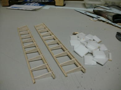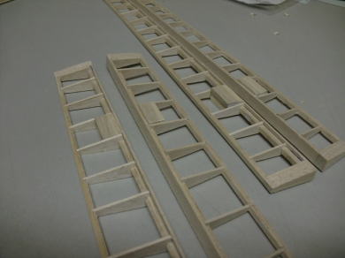 ● 木工ボンドでスポット接着していたスチレン材を抜き取りました。此れが内治具の効果です。左右のフラップ部材は、完全に同じ形状で仕上がります。あとは、低粘度(業界用語でシャブシャブ)の瞬間接着剤を各部の勘合箇所に染み込ませれば、強度は数倍に上がります。今回は、リブ間に補助リブを入れたのでリブ枚数が倍になっていますが、この構造により外部プランク材は1mmバルサでも充分強度を確保できます。