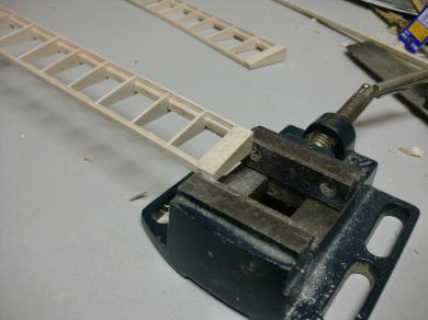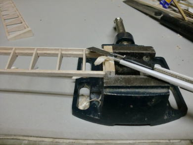 ● バイスで挟んだ翼端バルサは、そのままの状態でサンドホルダーを使い仕上げます。画像の様にリブ組動翼自体が軽いので、端っこを固定しても安定するんですけどね。今度は、10×5mmのバルサの棒材を前縁補助材に貼り込んで、ホーンの台座を作ります。