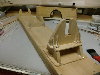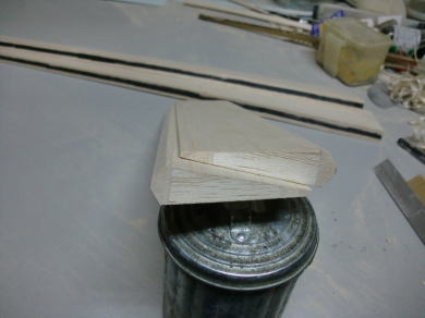● 前縁側の加工に入りました。前縁側はVカットを要するので、都合厚さが8mm必要です。まずは2mmのシートで前縁側の補助材とプランク面を完全に塞ぎます。木工ボンドを多めに塗布し、時間を掛けて自然硬化させます。ボンドが硬化したら今度は厚さ6mmのシートを接着します。これで必要寸法8mmです。ただ単に8mmのシートが無かったので、こういう工作方法としました。