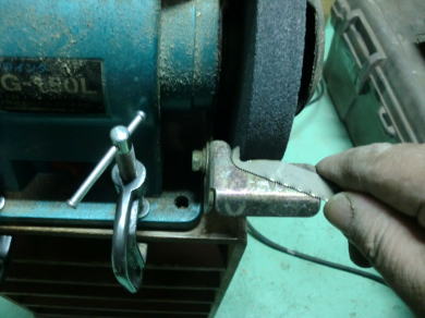 ● 画像はグラインダーを使用しての刃物加工中です。この金属鋸は、専用ホルダーに取り付ける事も出来ますが、画像右端の緑色の部分には、ビニールカバーが被せてありますので、指で掴んで使用する事もできます。そういう観点から、刃引きしてない側の面を加工して、特殊工具の加工をしています。