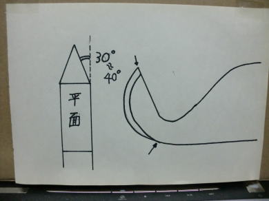 ● どうでしょうか・・・。市販されてるVカットエルロン材と同じ仕上がりに見えるでしょう。ただし、ムクのエルロン材と違い、リブ組プランクのエルロン材だと、重さが約55%程度に軽減されます。更に前縁側と後縁側を集成のバルサで積層したので、かなり捻じれに強い動翼となりました。翼根側と翼端側・・・相似形ですが、Vカット面は同じ角度(30度)で仕上がってます。これがテーパー設定のエルロン材です。