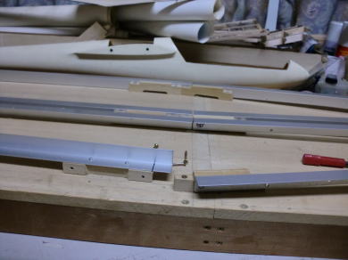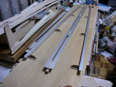 ● 治具定盤のセンター分けで、主翼の左右を組める様に治具を組立てますが、翼弦の関係上、前縁側は交差していますので、同時には組立てられません。しかしながら、アングル治具を正確に直線で設定し、更に後縁固定のアングル材に捻じり下げ設定を加えると、主翼全体は最初から捻じり下げの状態で部材が組み込まれていきますので、仕上がりも捻じり下げの付いた生地完成の主翼が出来上がります。