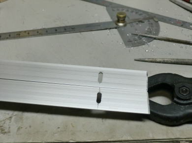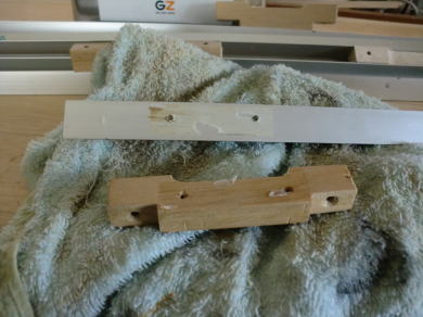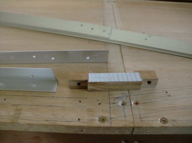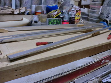 ● この木部材とアルミアングルの固定方法なんですが、先に両面テープで仮止めして位置を決めてから、更にアルミアングル側からタッピングビスで固定しました。今回は、このアングル材の木部材を一度取り去らって角度変更しなければ使えません。ところが接着固定した状態で、数年も経過すると粘着質の両面テープも表面が硬化してしまい、木部材と一体化していますので、中々スムーズには剥がれてくれません。