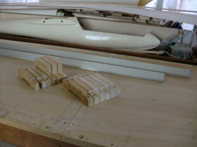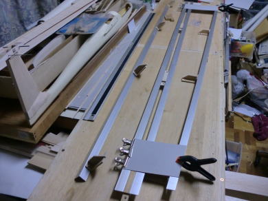 ● この形紙が其のまま本機のテーパー寸法となります。正確に寸法とテーパー角を合わせたら、各台座を小ビスで固定して行きます。ストレートなテーパー翼の組立・・・それも片翼900mmを越える寸法・・・、この主翼がフラットボトム(翼下面が平ら)なら、こんな複雑な治具なんか必要無いんですけどね。このアングル治具を、今後製作する2mバードオブタイムと4mKa-8にも使いますので、複雑なんですが・・・ちと!時間を掛けて作ってみました。