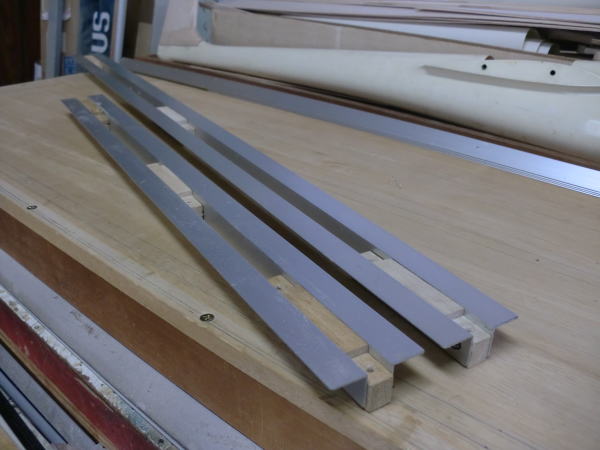 ● 本機(Frosh-Mt)のスパンは2760mmですので、当工房設計の(Lo-100)とあまり変わりません。そこで、この主翼組立治具を再設定して、フロッシュ用に仕様変更します。(Lo-100)の主翼構成なんですが、内翼は矩形・外翼は楕円翼の為、切り替わる繋ぎ目で主翼下面のみ上反角が入ります。主翼の上面は直線のままなので、リブ型が大変複雑でした。この治具に使用したアングル材を組み直してフロッシュ用に変更します。