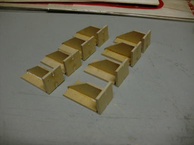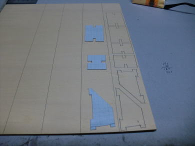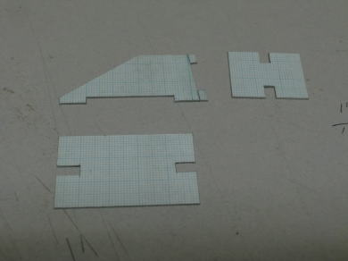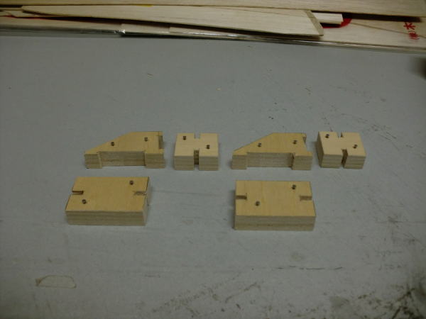 ● アルミアングルを固定する台座を作ります。何時もの様に形紙を作図して、3mmベニヤにトレースします。片翼分の台座は4箇所必要なので、合計8個分・・・4枚重ねで切り出します。