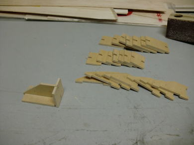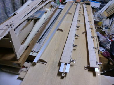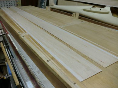 ● 主翼のプランク材の製作を行います。ある程度・・・バルサキットを製作されたモデラーさんなら、此方の作り方の方が正確な主翼が出来る事を知っています。リブ組主翼の最初の工程は、メインスパーの所定の位置にリブを接着し、前縁材と後縁材を取り付けてからプランク材を貼り込むのがセオリーなんですが・・・。プランク材を貼ろうとしたら、メインスパーが湾曲して組み込まれてしまい、後縁材も湾曲してました・・・。なんて経験がありませんか?。