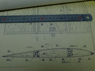 ● 原寸図面から採寸しボールペンでリブの取り付け位置も記入したら、余分なプランク材も2000mmの定規で切り落とします。本機の主翼は、メインスパーと胴体の中心線が直角で交差するストレート・テーパーに成っています。よって、前縁側のプランク材も後縁側のプランク材もテーパー加工を行いました。更に後縁プランク材は、リブ材が3,5度斜めに交差しますので、プランク材には3,5度の角度を付けて記入してあります。
