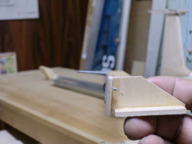 ● よって、画像の様に半対称翼型の下面を固定する治具を作成する場合は、メインスパー固定のアングル材は定盤に平行配置・後縁材を固定する場合は翼型に沿った角度に設定する必要があります。台座のアングル固定面が傾けてあるのはこの為です。原寸図面から計測したところ、約4度でしたので、台座も4度傾斜する様に設定しました。