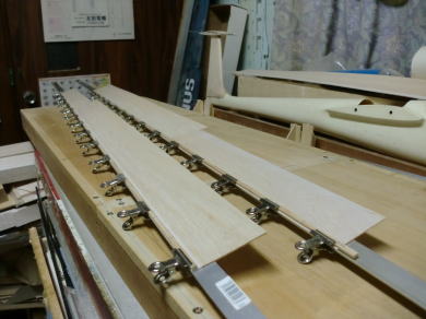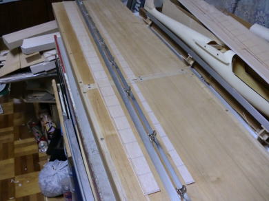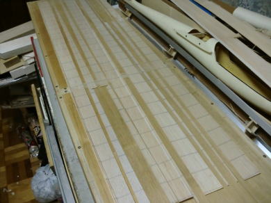 ● 実際に定規を当てて貼り込んでみると解りますが、繋ぎ貼りをしたプランク材は繋ぐ前に直線出しの加工と接着を行ったにも関わらず・・・定規を当てると僅かに湾曲しています。プランク材には余裕を見てありますので、メインスパーの直線出しを優先した組み立てを行う方が、その後の作業工程に支障が出ません。少々歪んでも、フィルムで修正すれば・・・って、場数を熟して行くと・・・自分が許せなくなりますよ(笑)・・・。