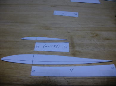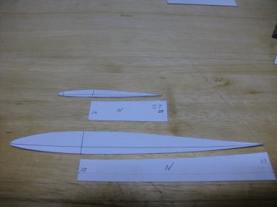 ● キット付属の原寸図面から、メインスパー後方から後縁材先端までの翼弦寸法を算出し形紙を作ります。其々・・・リブ三枚分の幅の形紙です。