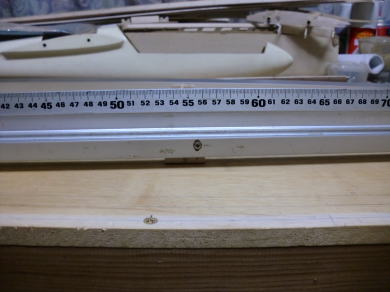 ● アングル治具の直線を出す時は、画像の様に1000mm以上の定規を当てて・・・隙間が無くなればアングル材は直線です。先に両端の台座の高さ寸法を27mmで調整し、ビスを締め込んで固定しました。中二つの台座は、定規を当てて調整しています。画像の様な位置配置で翼下面のプランク材を固定したら準備完了です。いよいよ主翼の組立工程に入ります(Part-6に続く)