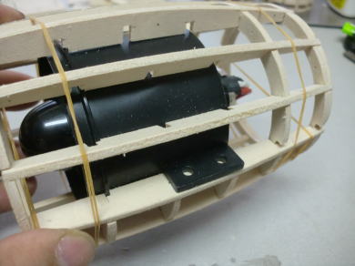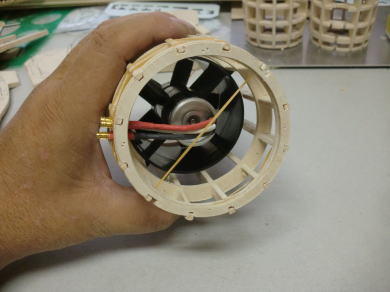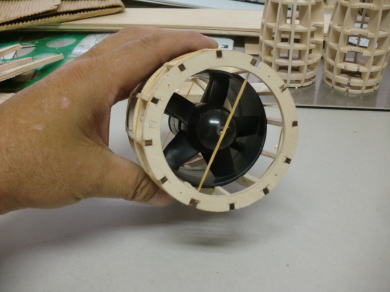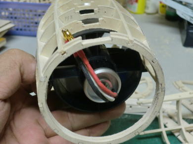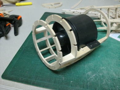 ● ポッド内部の構造体に専用ビスでプレートを固定するとこんな感じですかねえ・・・。コーン外部には2mmバルサのシートを全面張りしますが、その外直径に合わせてインテーク側にはインレットカウルを・・・エグゾースト側にはノズルコーンを其々厚手のバルサで造って装着後に形状を整えます。画像に見えるモーター本体から延びる配線コードなんですが、今の状況だけ見れば・・・枠に邪魔されてる様に見えますが、此処は成形後切り取りますので配線は楽に通せる様に成ります。組立の構造上・・・残す必要が有ったので、切り取り易い様に深繰りしてあります。