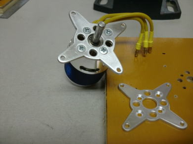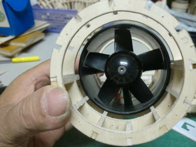 ● モーターを入れるとこんな感じです。プロペラの根元付近でも僅かですが後流が有りますので・・・推進力で受ける風圧との相乗効果で、発熱するモーターコイルから伝わる熱伝導を、このアルミプレートが吸収し冷却します。その後流はダクト内部を伝って後部排出孔から出て行きます。