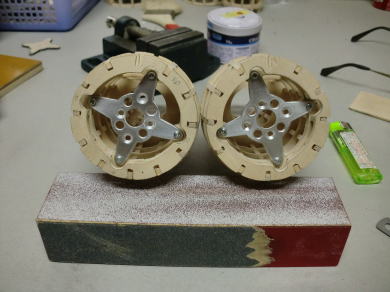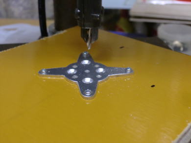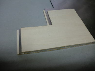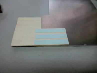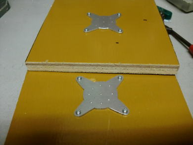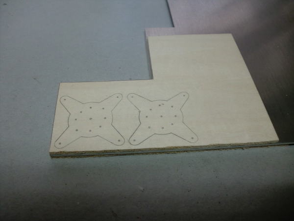 ● アルミ板を中芯にして両面をベニヤで挟む為に、両面テープで貼り込んでいます。何故にベニヤで挟むのか・・・曲線切りが主体の十字マウントの形状故・・・アルミの切り粉が飛散するのを防ぎ、尚且つ表面がベニヤなのでトレースした線が良く見えるので失敗が起きません。アルミの切り粉が糸鋸の刃に噛みついて折れるのを防ぐ目的もあります。裏面だけなんですが高さを合わせる為に、アルミ板の四隅に同じ厚みのベニヤを貼っています。板が斜めに成ってると・・・此れも糸鋸刃が折れる要因になります。