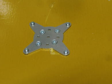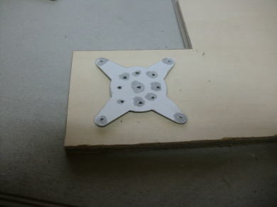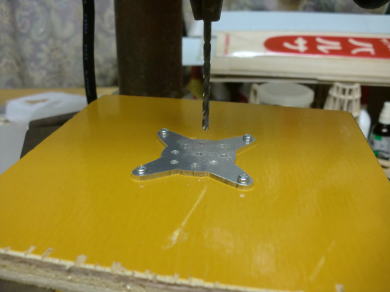 ● この十字プレートの四隅の先端孔位までは指の圧力で押さえつけられるんですが、此れが中心に近く成れば成る程・・・指先での固定が難しく成ります。よって10mm以上の厚みのあるコンパネ等にタッピングビスで固定するのが安全です。ドリルの刃先がアルミ材に食い込んで、廻り出したら指先なんか直ぐに裂傷しますし、外れると高速回転のアルミプレートが手裏剣状態で作業者の顔面を襲うからです。しかし、板に固定すれば板をしっかりと持てるし・・・刃先から離れているので怪我する確率は大幅に減少します。