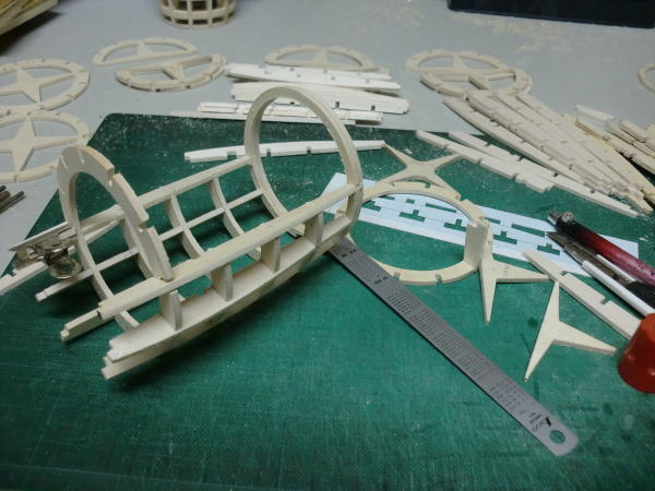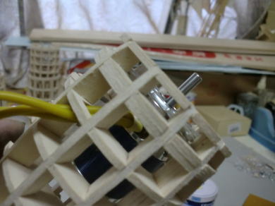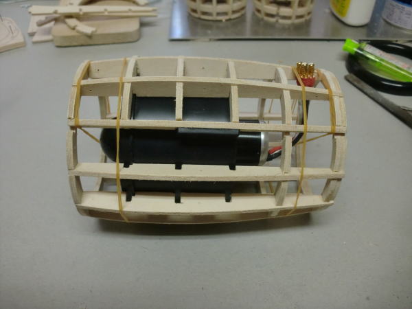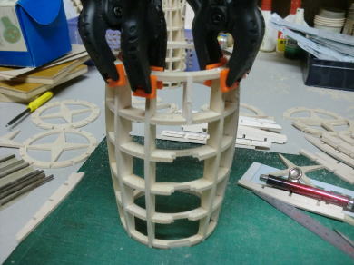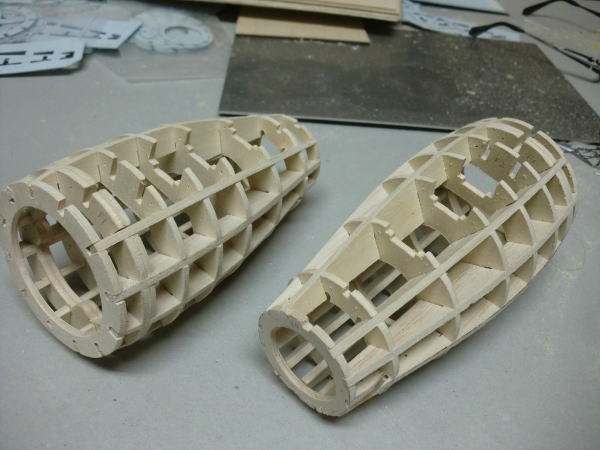 ● 本番用のポッドに接着剤を入れて組立てました。吊下げる為の加工を一部行っています。このポッドの枠組みにバルサシートでプランクすると、驚く程頑丈に成ります。今の状態でもかなり強固な状態です。試作型のリブはオールベニヤでしたが、今回は4枚のみベニヤで残りはすべてバルサのリブです。