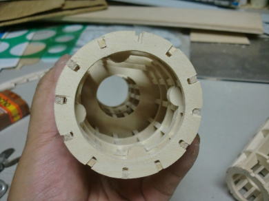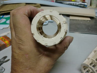 ● ファンユニットのポッド組立に入りました。部品を細かく調整しながらの接着作業なので、スムーズには組み上がりません。形紙でトレースすると、シャーペンの芯の周りを補強している金属製のガイドパイプの分だけ大きく卦がいてしまいますので、その分を見越して形紙を小さくするんですが・・・中々どうして・・・すんなりとは行きませんなあ・・・。戦闘機の部品を三菱から取り寄せても・・・すんなりとは組み込めないのと似てますがね・・・。微調整するのは実機も模型も同じって事で(笑)・・・。