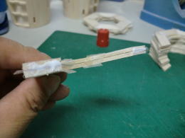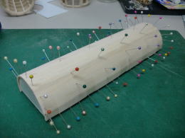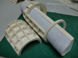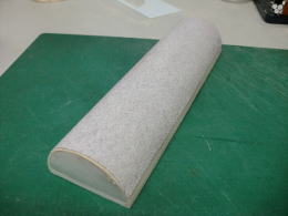 ● このサンドホルダー・・・作って大正解!・・・。更に粗い60番のサンドペーパーを貼ったので、そらもう!バリバリ削れます。ベニヤでも其れなりにホイホイ削れるんで、作業が更にスピードアップしました。ホルダーの直径をダクトよりも若干小さくしてあるので動きもスムーズ・・・。前後に動かして削る・・・手首にひねりを加えて削る・・・もう自由自在です。発想は単純ですよ。半円形で手の平でしっかり持てて、長いホルダー・・・がコンセプト・・・。5mmのスチレン材の威力って凄いでしょう!・・・。