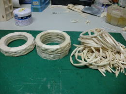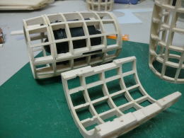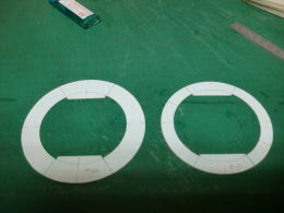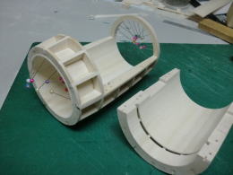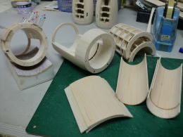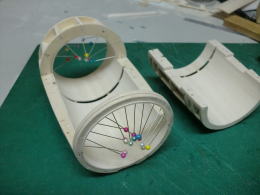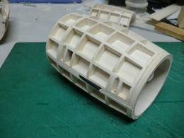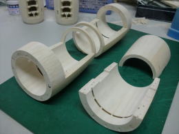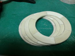 ● 輪切りの積層部品・・・此れが二基一機分です。カウル側が厚さ12mm・・・コーン側が18mm・・・。別に9mm(3枚積層)と21mm(7枚積層)でも良かったんですが、ポッドは翼型構造が基本なので・・・コーン側を延ばすと見た目は綺麗ですけど、肉厚が薄くなるので強度が落ちます。という理由で・・・カウル側12mm(4枚積層)・・・コーン側18mm(6枚積層)で決定しました。