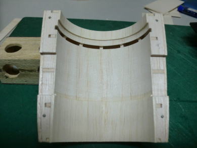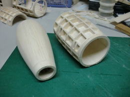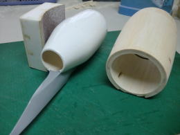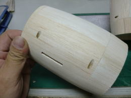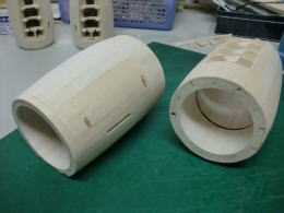 ● さて!・・・此処からは削って削って削り倒すお時間・・・。何故に複雑に部材を継いで積層したのか・・・。木目をポッドの円周方向で統一して、削り易くする為です。よって常にサンドホルダーは、ポッドの円筒方向に平行に前後しながらサンディング・・・。要するに、常に積層板の木目に直角にゴリゴリ削れる様にしました。そらもう!・・・粗めの60番ですからねえ・・・削りは豪快に。でも仕上がりは綺麗でしょ?・・・。