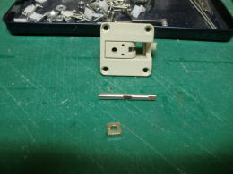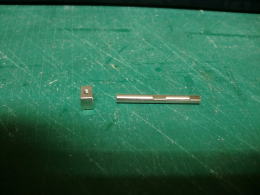 ● この綺麗に銀メッキしてある金属部品なんですが・・・この四角形のストッパーにシャフトが入りません・・・。寸法をデジタル表記のノギスで計測した所、ストッパー側は(約3,5mm)の孔・・・シャフトの直径は(3,95mm)・・・此れではシャフトは入りません。多分・・・強度を要する箇所なので、焼きが入ってるならばストッパーには超硬刃のドリルでしか孔は開きません・・・。やれやれ・・・。それと!此処は重要なので38親分に質問して下さいね。