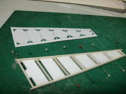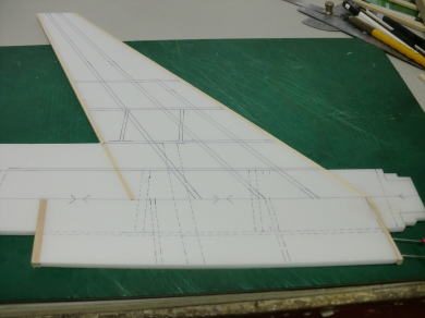 ● 其々の座標を線で結ぶと、リブの取り付け位置やスパー材の貼り込み位置が表記されます。所々にスリットを入れてありますが、此処に棒材を貼るとこのシートの前縁と後縁がバルサの部材と同じ扱いに成ります。
