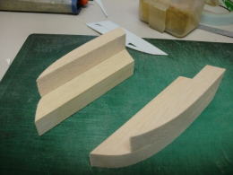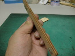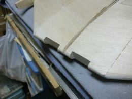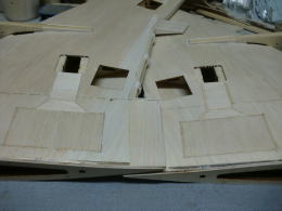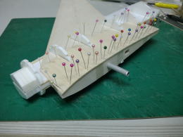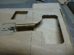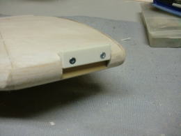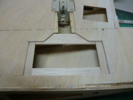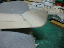 ● 胴体側の主翼の結合ピンを受ける孔位置が、左右で高さが違います・・・。主翼内部の好い加減な補強バルサの角材の状況から、左翼は辛うじて補強バルサにピンが埋められますが、右翼側は・・・ピン自体が露出する為、薄いプランクシートだけでは保持出来ません・・・。其処でピン打ちを必要としない形状に変更しました。翼型よりも露出した平角ダボを囲む様に受けを形成すれば、ピンと同じ様に固定出来ますから・・・。此れは昭和50年代に加藤無線(MK)から発売されたF3A仕様フォッケウルフに採用された主翼の固定方法ですので、既に確立されています。