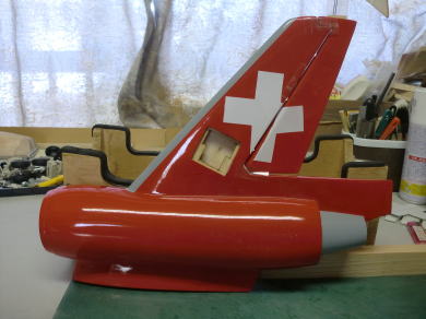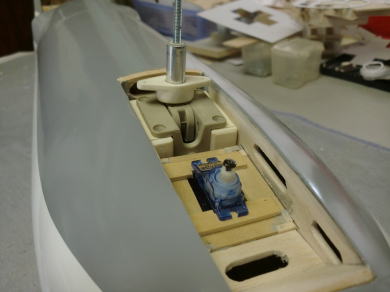 ● 画像は新しく作り直した本機の垂直尾翼です。内蔵のラダーサーボは、垂直尾翼の両面に長孔を設けてあります。ラダー面積を本機付属のラダーよりも大きく・・・更に軽く作って有ります。画像のアジャスターは、ヘリコプターのメインブレードをコントロールするスワッシュ・プレートに繋ぐ両ネジ型のロッドです。現在の電動ヘリコプターでもエンジンヘリコプターでも使用される、リンケージのガタを極力減らす方法です。
