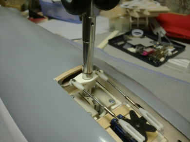 ● 本機付属のツルピカ仕上げ?の垂直尾翼に内蔵するラダーサーボから、ラダーをコントロールするリンケージは、画像の1mmの鉄線一本のみ・・・。此れを使う時の定義は、サーボホーン側もラダーホーン側も一切の孔のガタは許されません。今のプロポはデュアルレート(舵角の任意調整機能)があるので、其方で調整せよ!・・・という事なんでしょうけど。孔のガタを一切無くすにはボールリンクを使うしか方法がありません。片引きで、しかもクランクZ曲げの鉄線一本だけのリンケージを、5キロを超える大型ラジコン機に使う方が危険です。