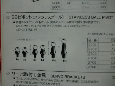 ● 本機のリンケージに必要な極力ガタを無くすボールアジャスター関連の部品を掲載しました。こういう細かい記載は、ネット上では解りませんしね・・・。サーボホーン側と動翼ホーン側両方に、このボール型アジャスターを使うのが理想なんですが、動翼側のみボールアジャスター・・・サーボ側はクイックキーパーを使うのが、リンケージとしては最もポピュラーです。