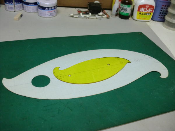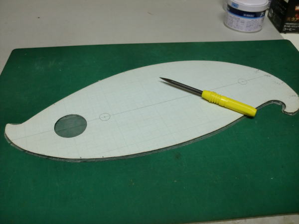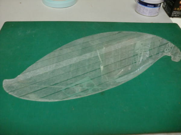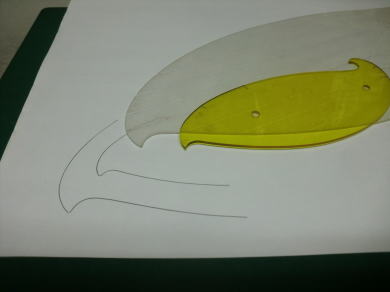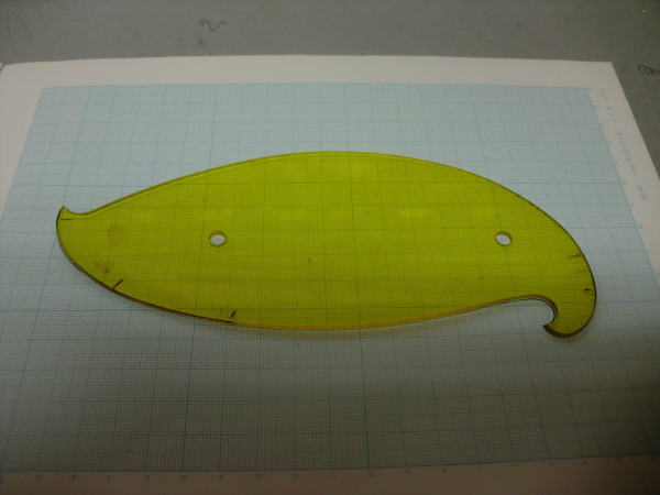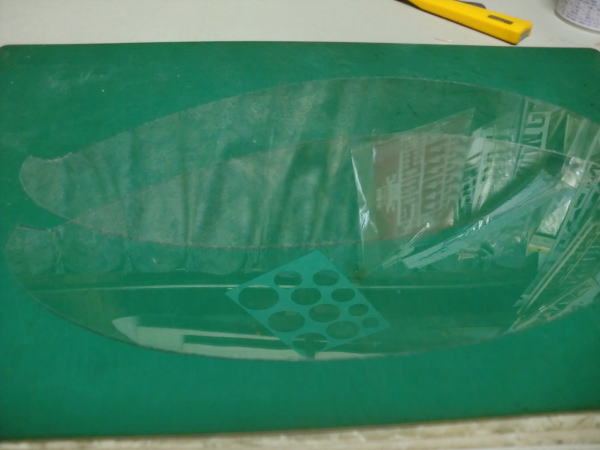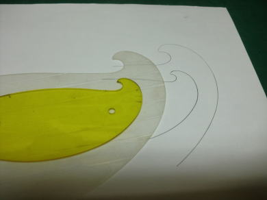 ● 作った厚紙製の雲形でも充分定規には成るんですが、左右対称でラインを引く時に具合が悪い・・・。主翼の翼端ラインも左右対称でしょ?。楕円翼ならばなおさらですし・・・。胴体の側面図・・・特に大型グライダーの機首部分の特徴あるアールのライン引きには使えるんですがねえ・・・。これが機体の胴体の上面図となると、この浸透性のない厚紙の雲形では作図が面倒臭くなるんですよねえ・・・。そこで!透明性のある雲形定規へと更に加工を続けます。
